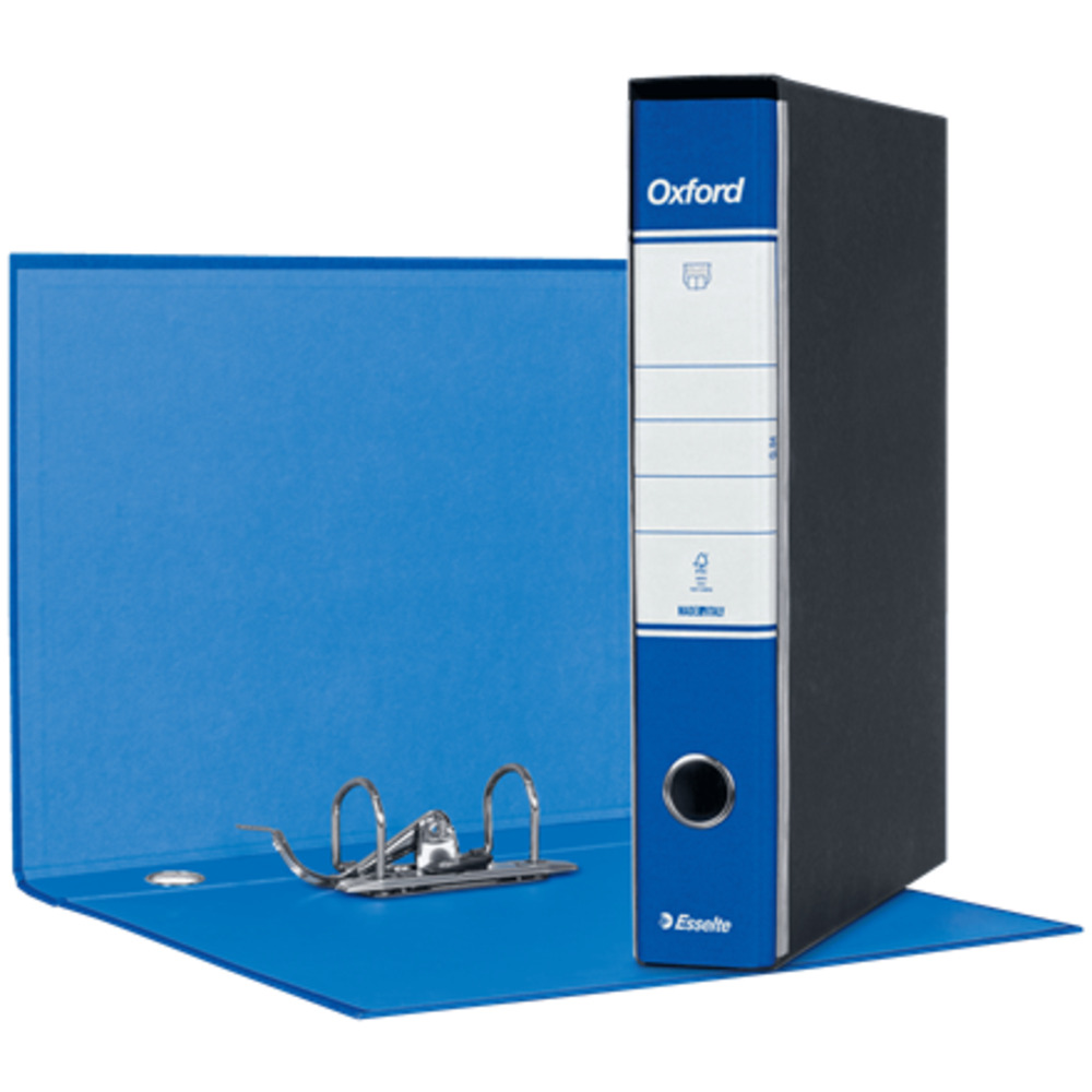 Registratori Oxford di Esselte con struttura in cartone da 2 mm di spessore rivestito di carta goffrata con finitura lino.