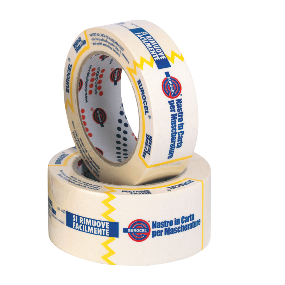 Nastro in carta semicrespata liscia, adesivo base gomma naturale.