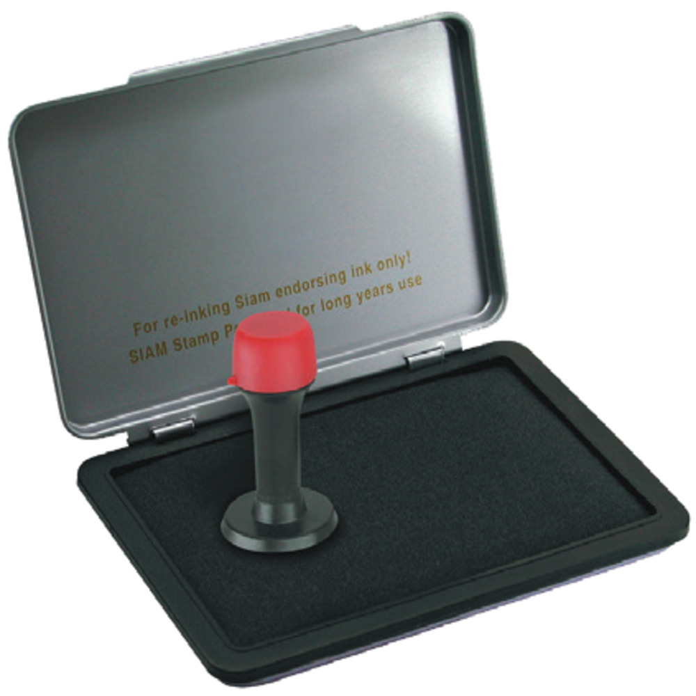 Timbro in gomma con elegante scatola metallica. Le dimensioni sono 16x8 cm e l'inchiostro è di colore nero, ideale per impronte nitide e durature.
