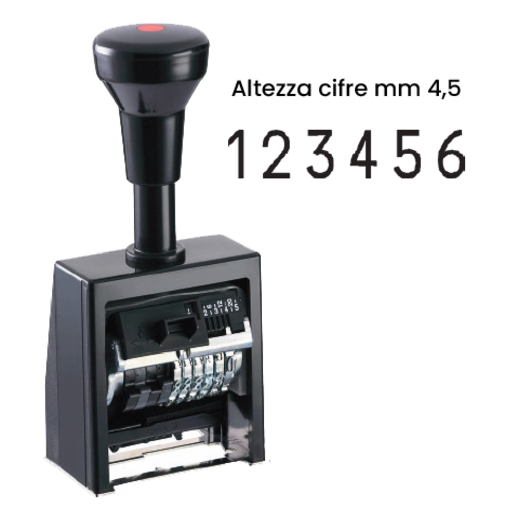 NUMERATORI AUTOINCHIOSTRANTI: con montatura in metallo ed impugnatura ergonomica in robusto materiale plastico; dotati di 6 ruote, in metallo speciale, che permettono di numerare con o senza zeri precedenti.