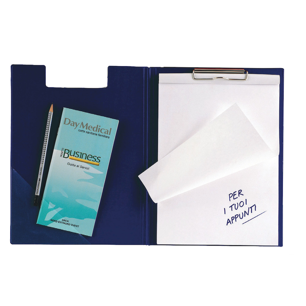 Portablocco Colpan® in cartone rivestito PVC, con molla d'acciaio e tasca interna. Formato contenuto 21x29,7 cm, ideale per appunti e documenti.