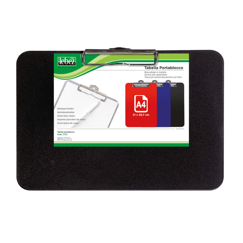Portablocco Lebez in PVC nero, ideale per fogli A4. Dotato di tasca personalizzabile e bloccafogli metallico, misura 32 x 23 cm.