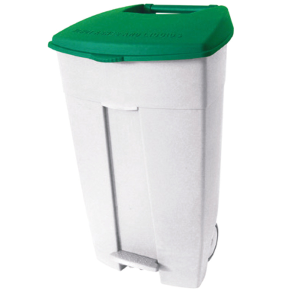 Contenitore 120 litri con ruote e pedale in polietilene ad alta densità (HDPE) con sistema d’apertura del coperchio in alluminio verniciato.