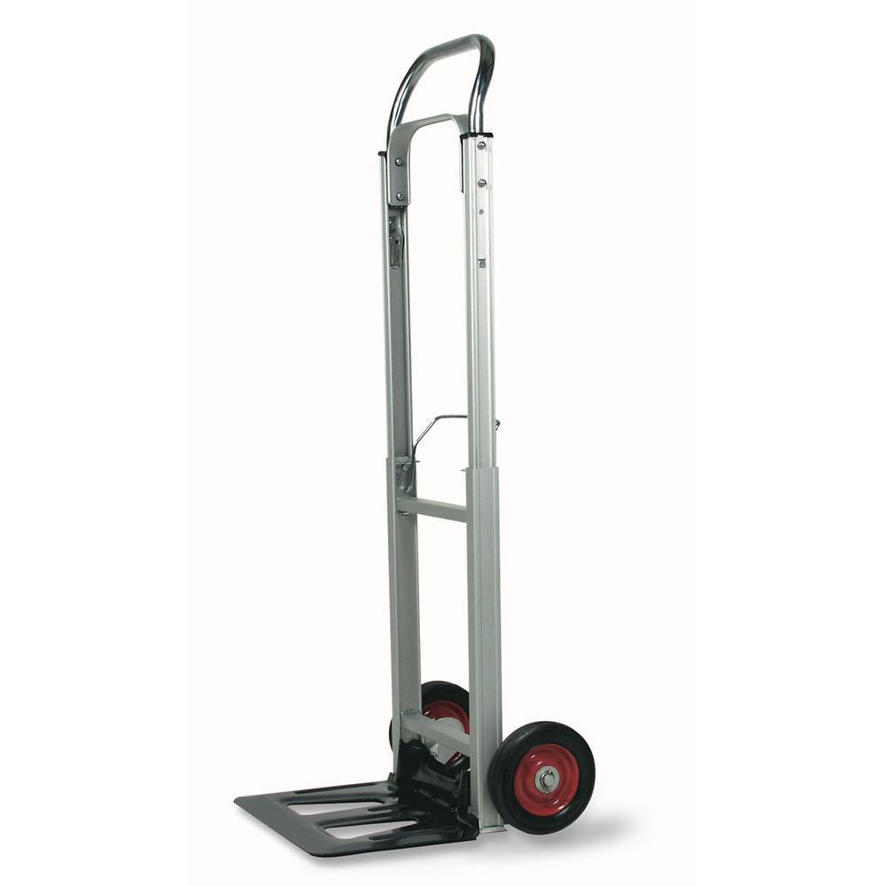 Carrello realizzato in alluminio con manico e base ribaltabili. Dotato di ruote piene in gomma. Portata massima 90 Kg.