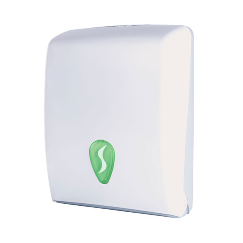 Distributore in ABS riciclato, resistente e versatile. Accetta carta piegata a Z, C e V, con capienza fino a 600 fogli. Erogazione inferiore, chiusura sicura con chiave inclusa. Dimensioni: 27,7x13x37 cm.