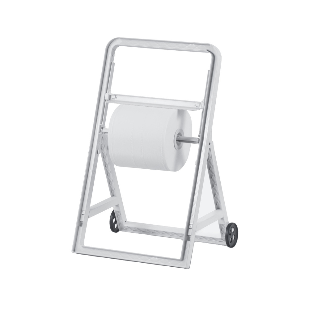 Cavalletto in plastica per rotolo industriale in plastica con ruote da pavimento.