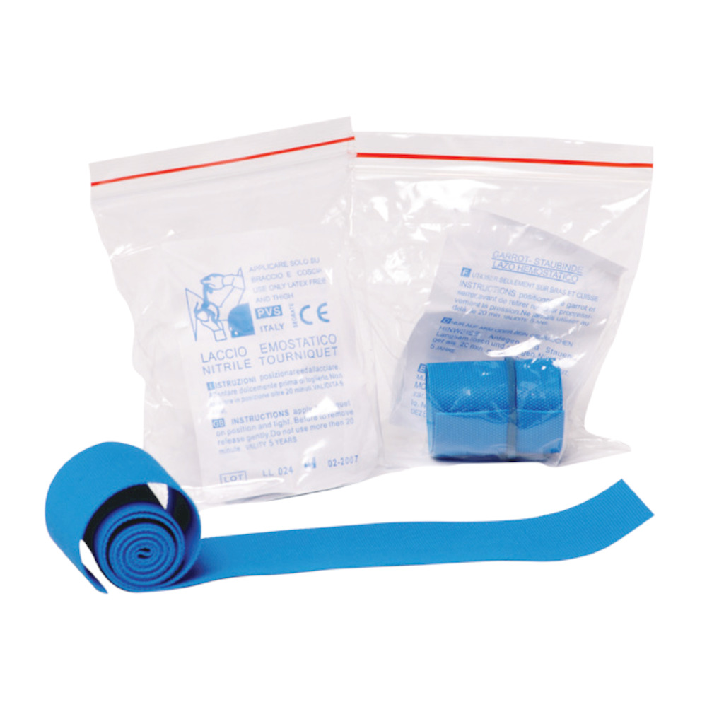 Laccio emostatico piatto in nitrile, privo di lattice, per fermare emorragie. Lunghezza 46 cm, ideale per procedure mediche e pronto soccorso.