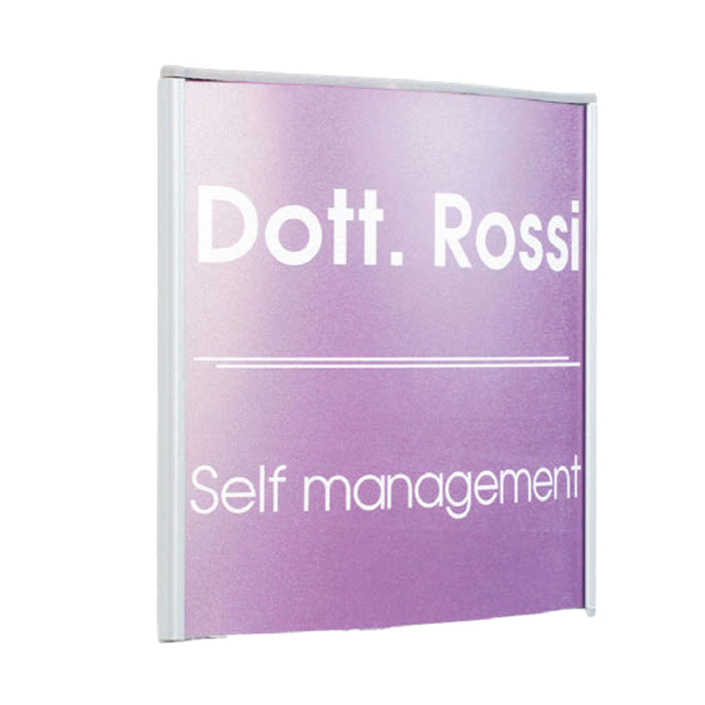 La targa a parete Marcos1 è perfetta per la segnaletica interna. Realizzata in alluminio silver con terminali in ABS, ospita grafica intercambiabile protetta da un foglio in PVC antiriflesso. Ideale per indicazioni d'ufficio o di stanza.