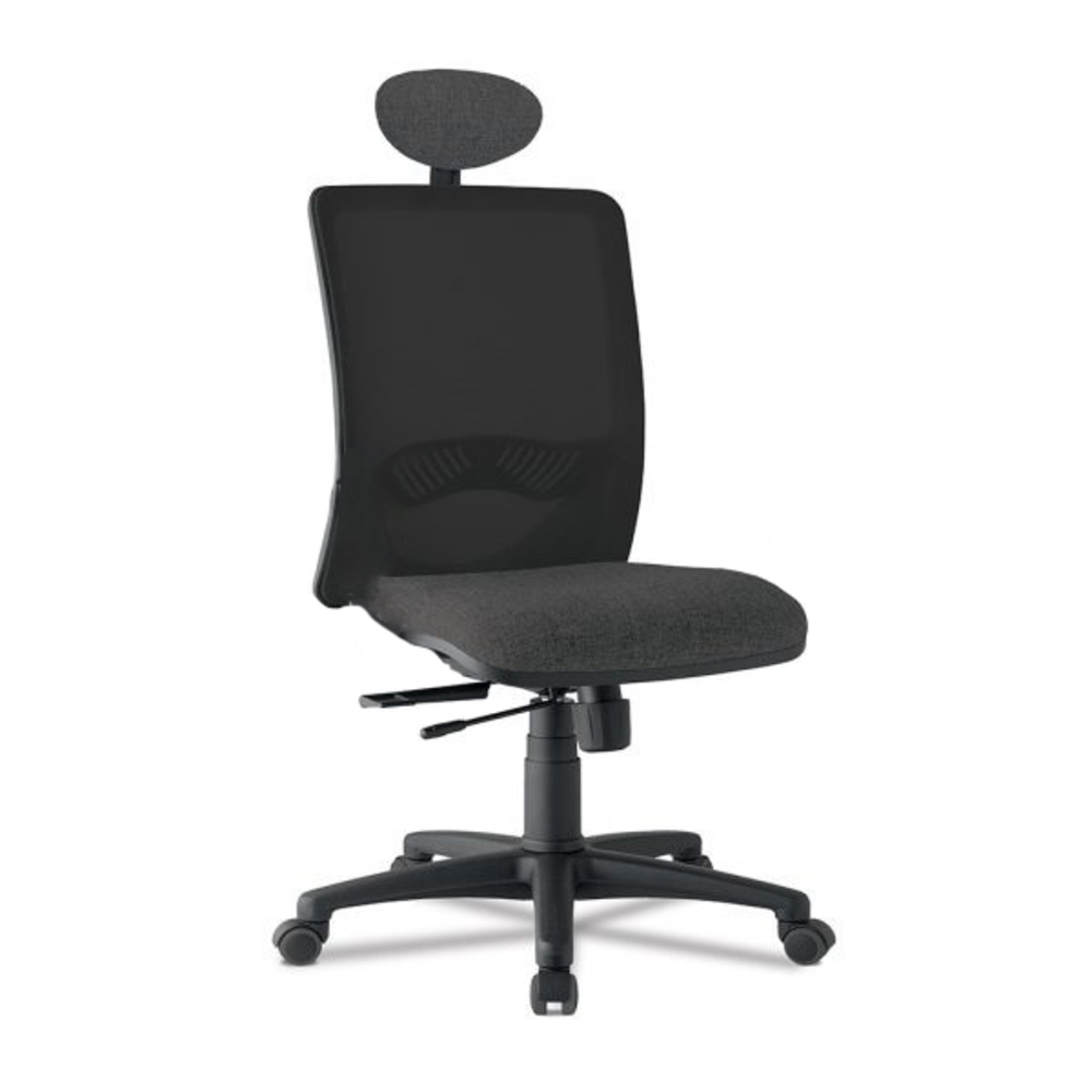 Poltrona operativa con schienale in rete traspirante e supporto lombare regolabile.