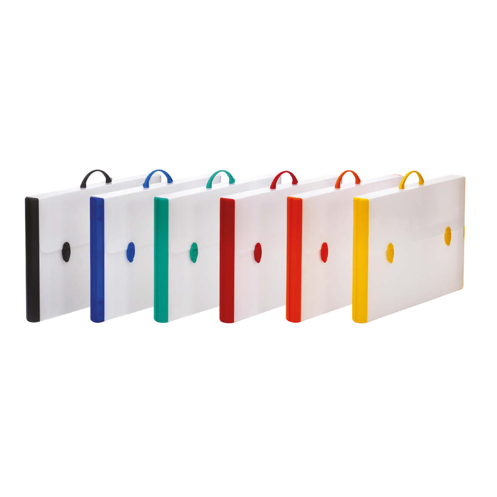 Valigetta in polipropilene alveolare neutro con dorsi rigidi arrotondati in polipropilene e bordi rinforzati.