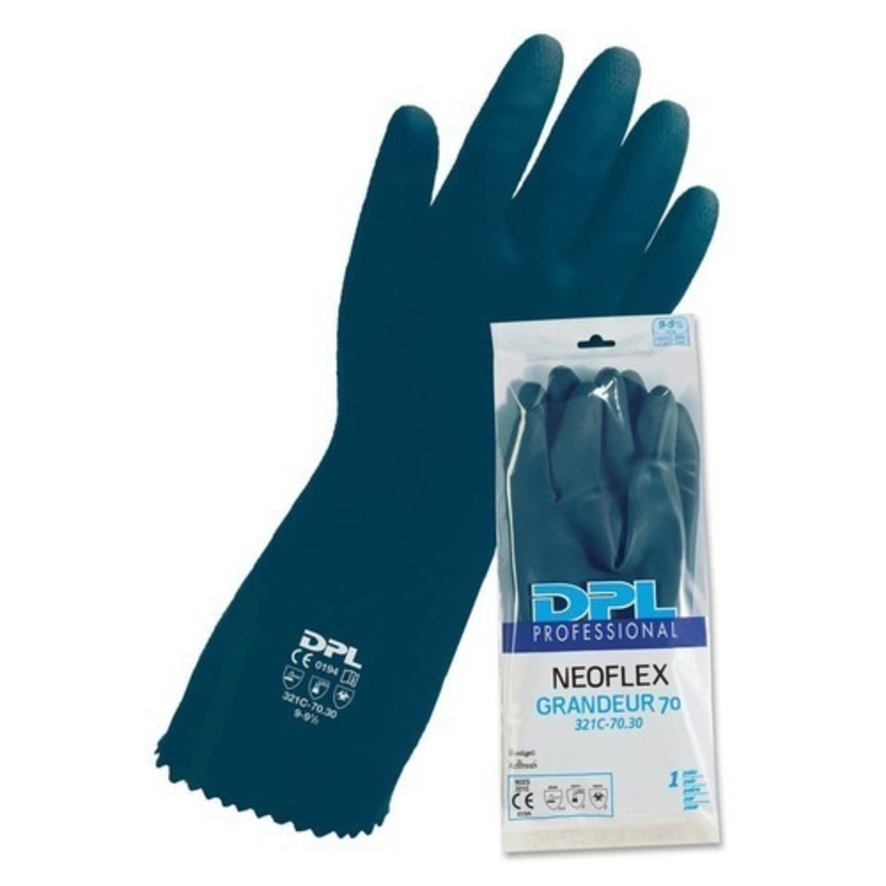 Guanto riusabile in MESCOLA DI POLICLOROPRENE+LATICE DI GOMMA NATURALE alogenato,di forma anatomica per mano destra e sinistra. Felpato internamente, trattamento interno antibatterico.