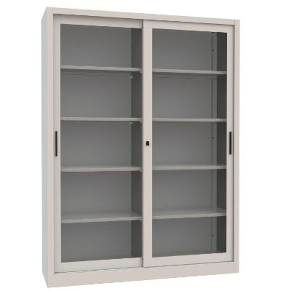 Armadio ad ante scorrevoli in cristallo su cuscinetti inferiori e superiori, maniglia in materiale plastico colore nero.