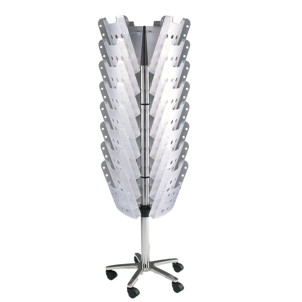 Struttura cromata montata su ruote e 24 vaschette disposte su tre lati che possono contenere stampati fino al formato 24x30 cm.