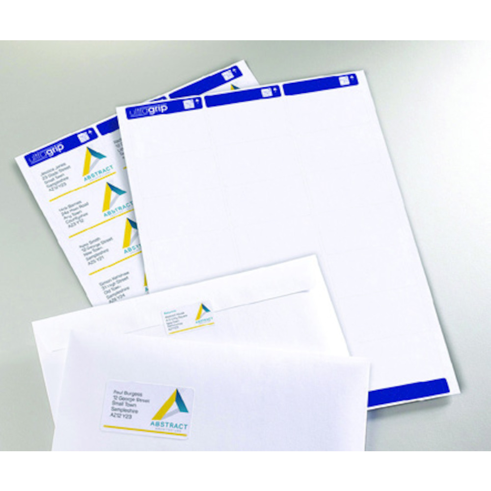 Etichette bianche Avery con nuova tecnologia Ultragrip™ presa sicura, che permette di alimentare i fogli nella stampante in maniera perfettamente allineata e senza inceppamenti.