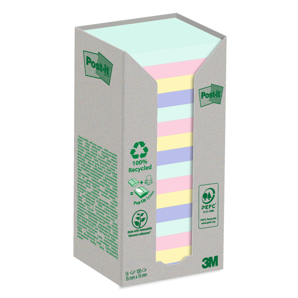 Foglietti Post-it® collezione Nature, realizzati al 100% in carta riciclata con adesivo realizzato al 60% con risorse rinnovabili da piante a ricrescita annuale.