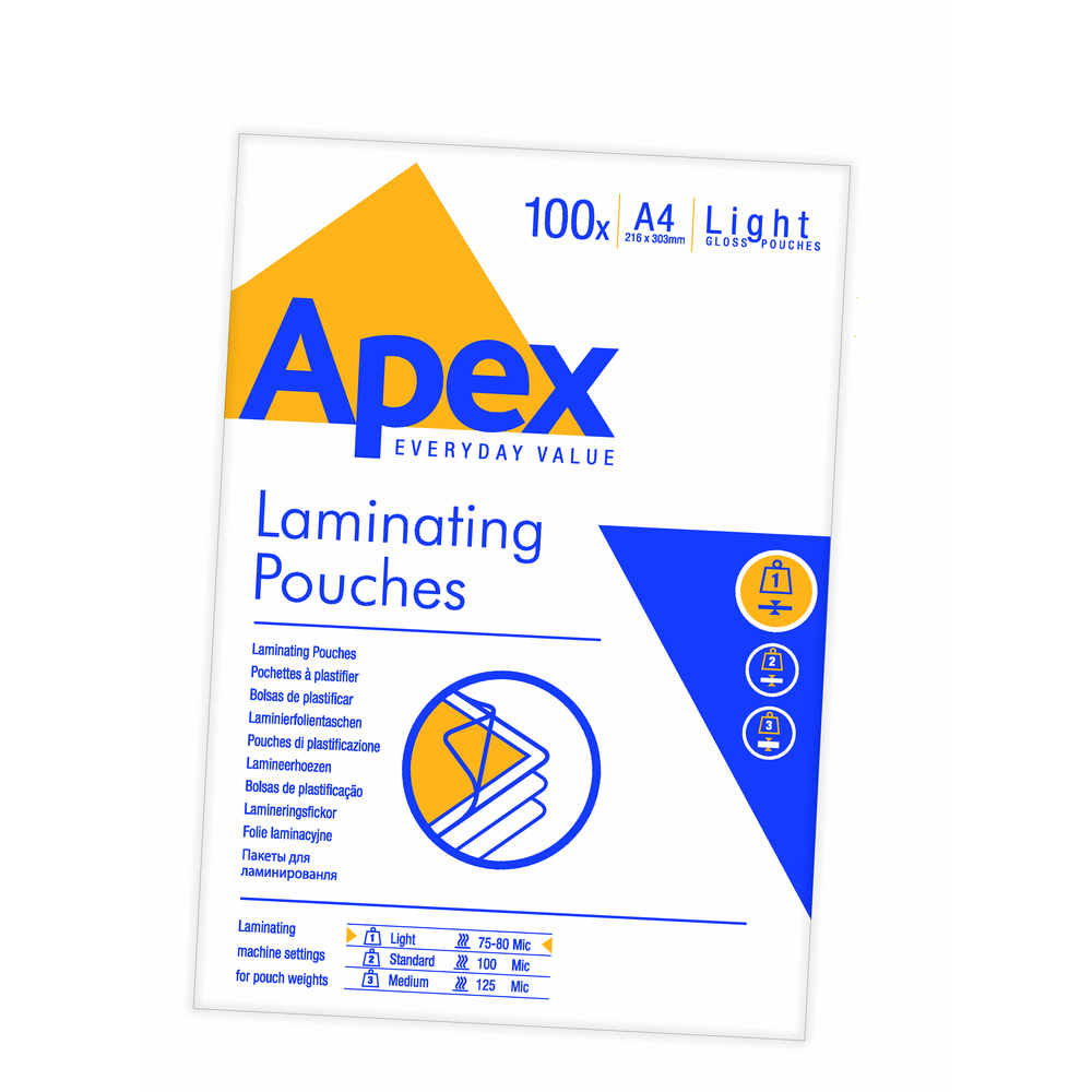Fogli plastificanti lucidi, formato A4 (216x303 mm). La confezione contiene 100 pezzi, ideali per proteggere documenti e foto con una finitura brillante.