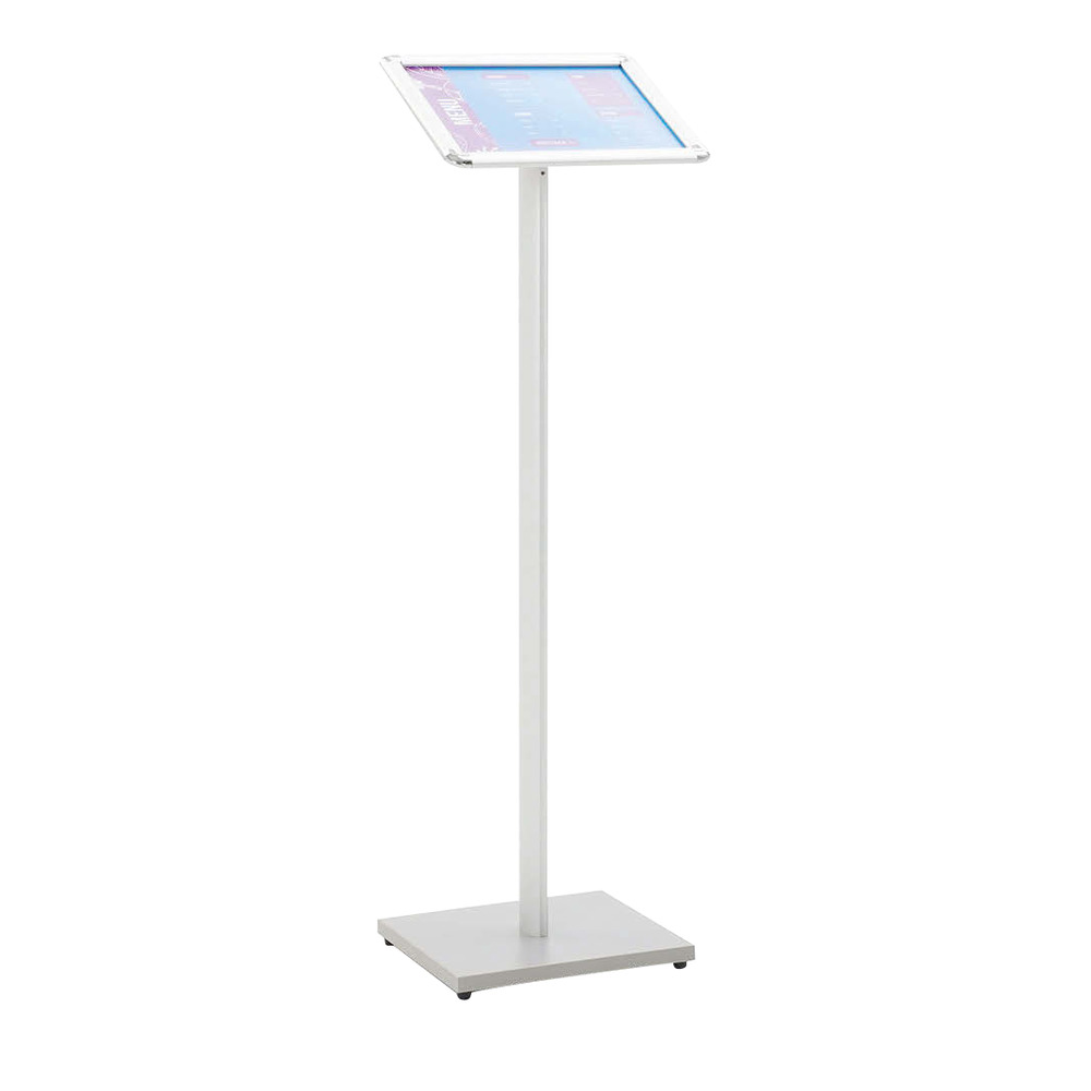 Espositore a leggio da terra con cornice a scatto orientabile in verticale o in orizzontale, in alluminio finitura silver con angoli arrotondati formato A4.