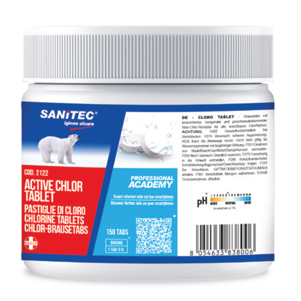 Detergente in pastiglie Sanitec cloro attivo per la pulizia di superfici lavabili e il trattamento di acque di lavaggio di frutta e verdura.