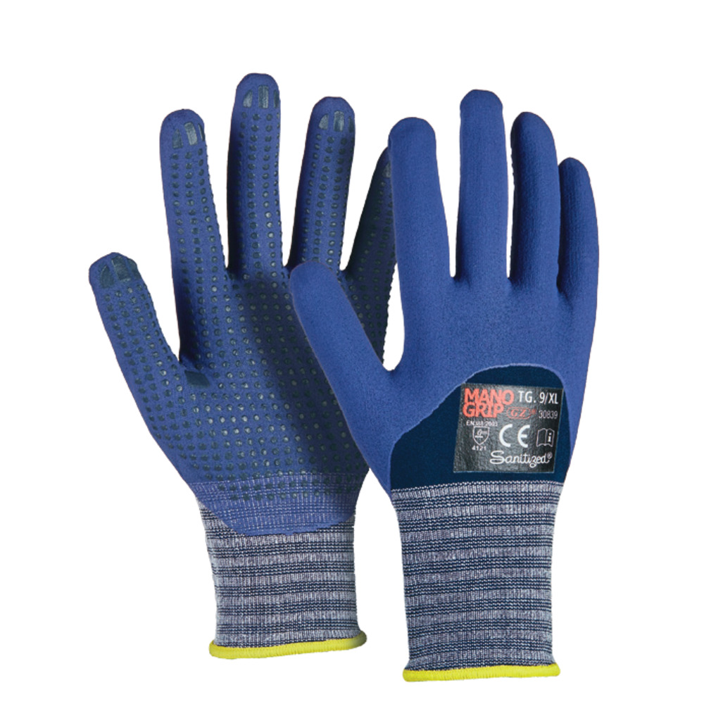 Guanti blu in nylon/spandex, con finitura in nitrile foam. Ideali per l'industria chimica, assemblaggio delicato, cantieri e servizi igienico-sanitari. Taglia L.