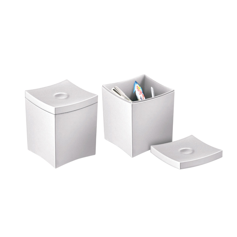 In poliestere ricilabile antiurto, in grigio opaco per contenere piccoli rifiuti da tavola. Coperchio rimovibile, impilabili senza coperchio. Capacità 0,6 lt, dimensioni totali cm (l x p x h) 9x9x10,4.