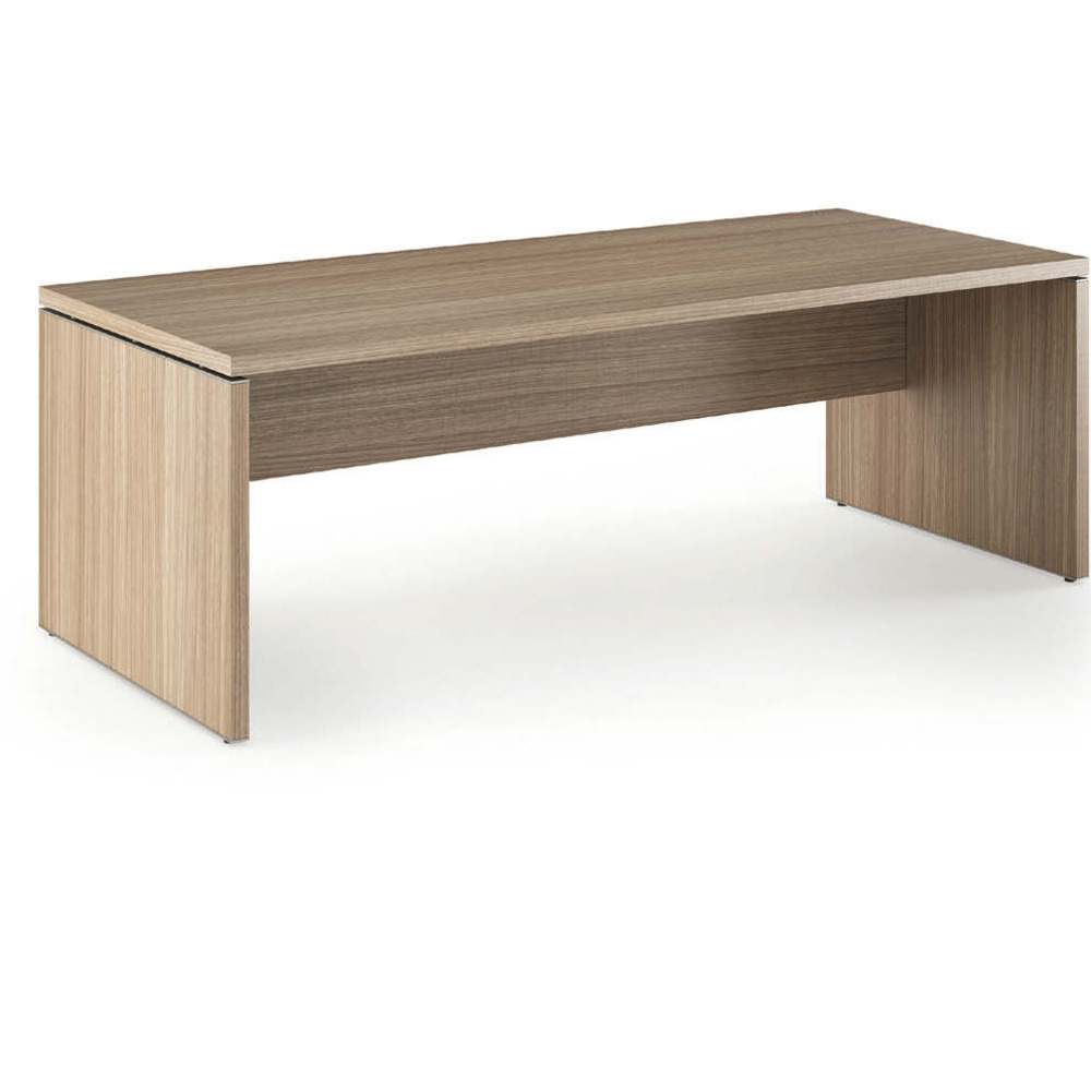 Scrivania direzionale Elegant pannellate con desktop e fianchi sp. 38 mm e bordo antiurto in ABS 3 mm colore grigio alluminio sul lato superiore e inferiore dei fianchi.