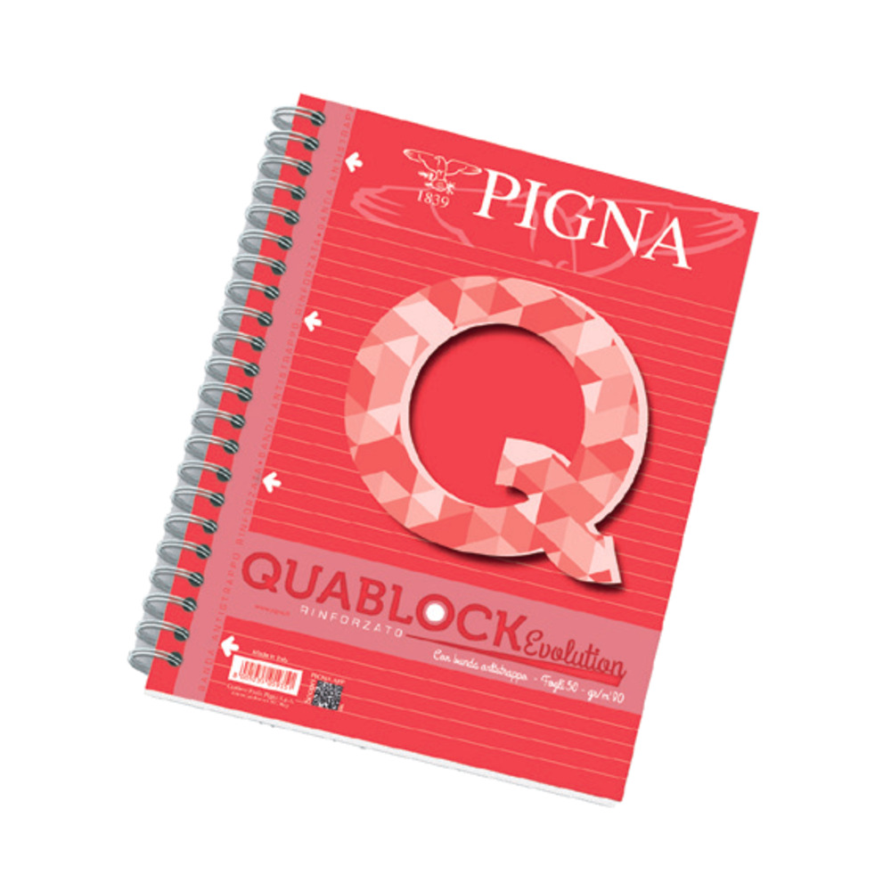 I Quaderni Pigna Quablock Evolution hanno coperture spiralate e rinforzate con banda antistrappo. Sono in formato A4+ (22x29,7 cm) con 40 fogli da 80 gr e righe 1R.