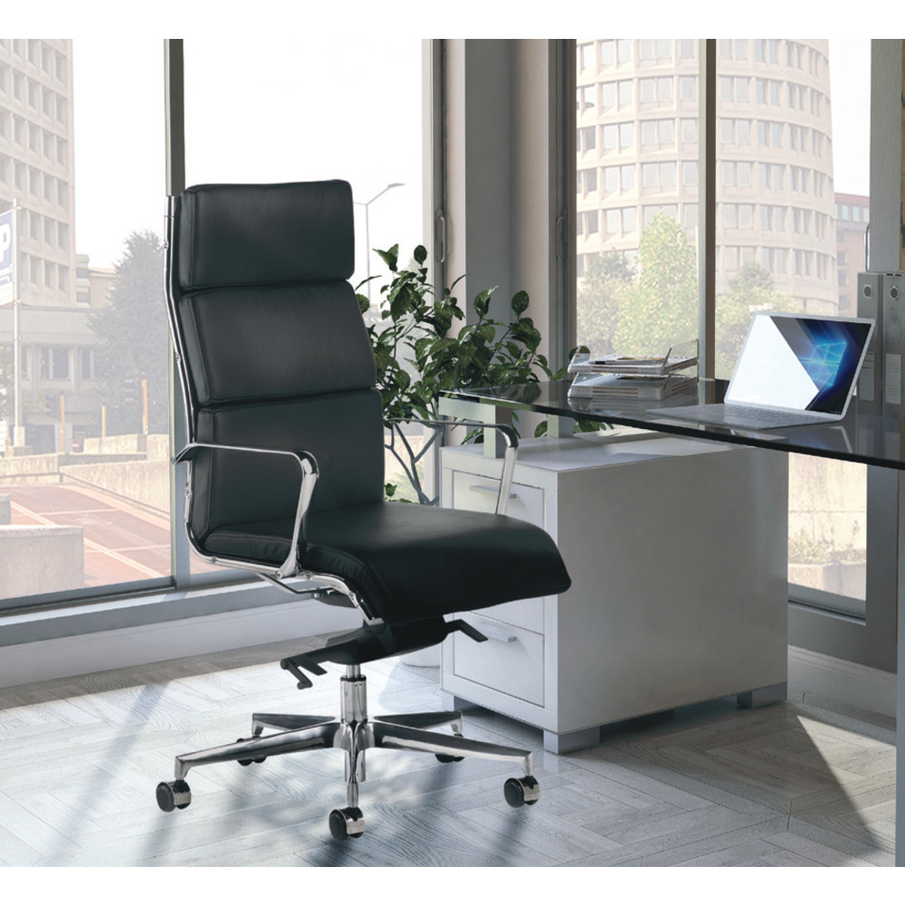 Poltrona direzionale con schienale fisso alto, con struttura in rete portante rivestita ed imbottita in ecopelle.