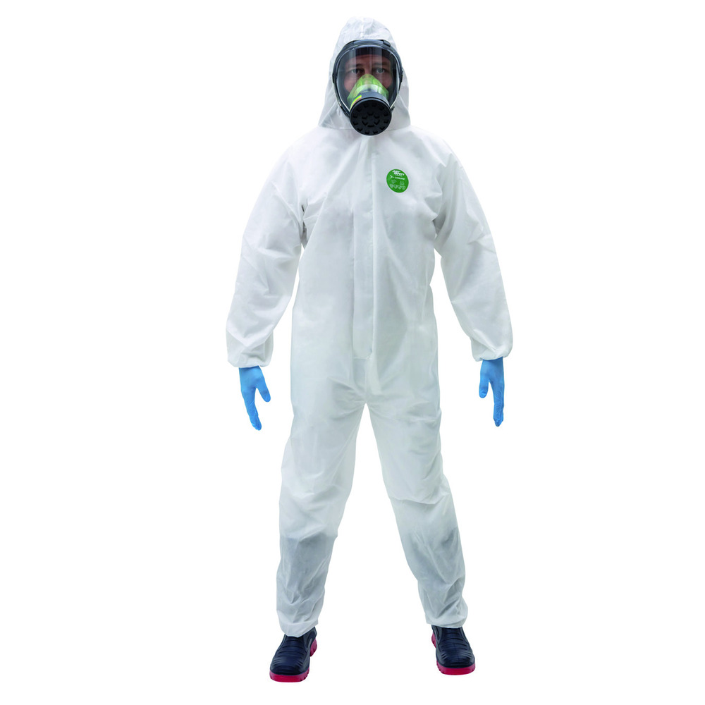 Tuta intera monouso con cappuccio, apertura frontale con zip coperta da patta, elastici alle caviglie, sul cappuccio, alla vita ed ai polsi e cuciture saldate.