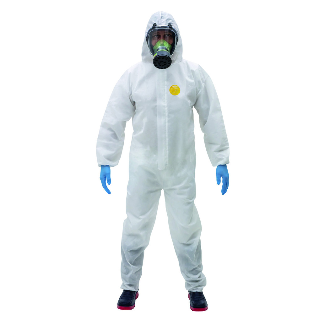 Tuta intera monouso con cappuccio, apertura frontale con zip coperta da patta, elastici alle caviglie, sul cappuccio, alla vita ed ai polsi e cuciture saldate.