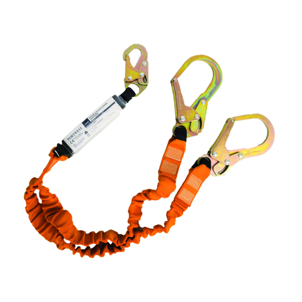 Questo cordino doppio di Portwest presenta un assorbitore, un gancio per impalcature e un moschettone.