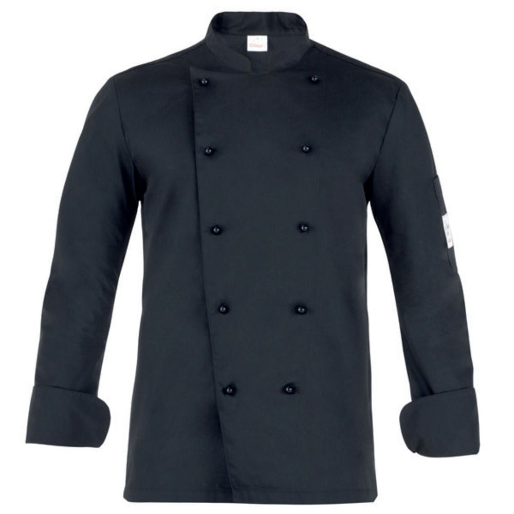 Giacca da cuoco Giblor's Adriano, maniche lunghe e vestibilità slim fit. Abbatttonatura doppio petto, collo e polsi arrotondati, porta penne. Tessuto: 65% poliestere, 35% cotone. CAT. I.